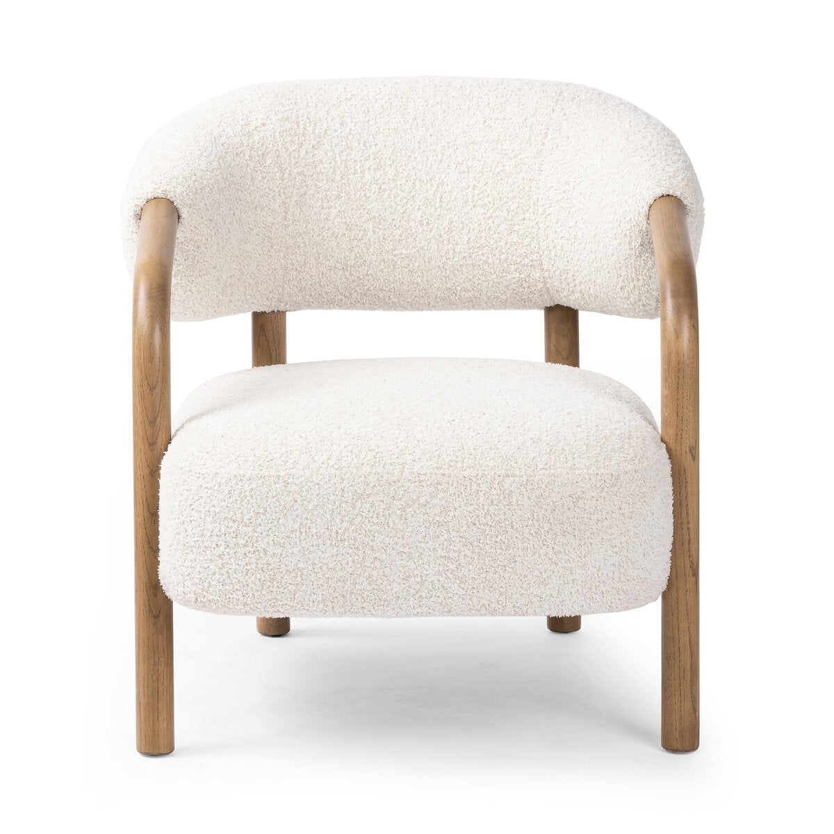 A cozy spot to lounge with its high-pile texture and bulky taper, a sculpted chair is a modern take on 1970s seating. A solid oak frame in neutral grey complements soft, ivory upholstery.