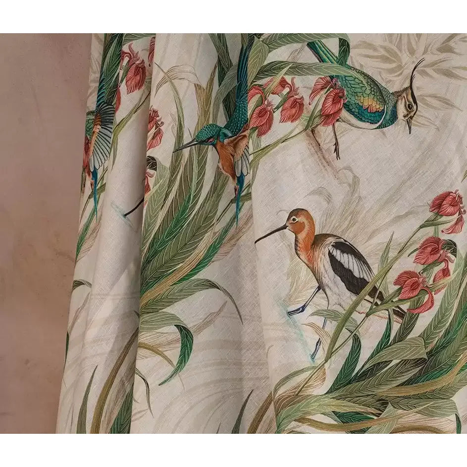 Kingfishers, lapwings and avocets, along with aquatic grasses and water irises, are arranged in a stripe repeat in this tranquil design.