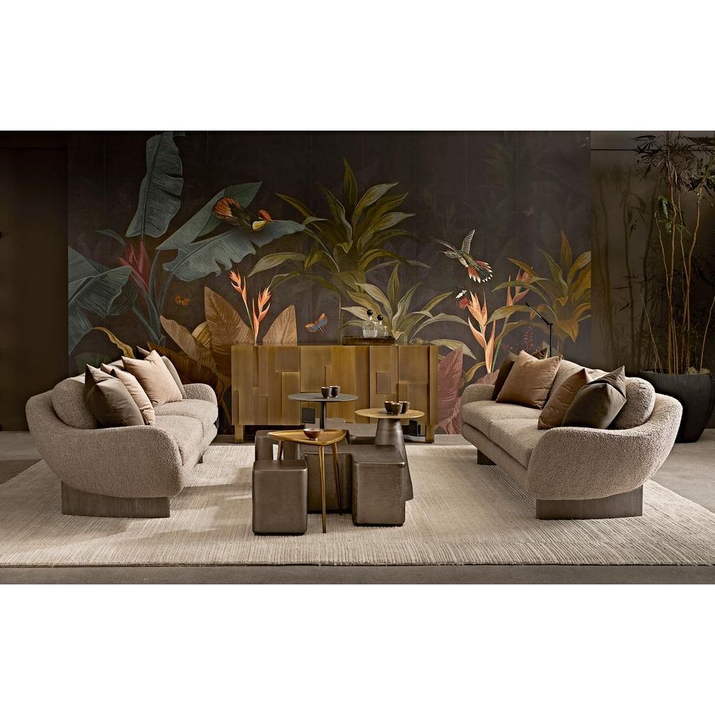 The wood frame of the Acora buffet, featuring three-dimensional door fronts, is wrapped in beautiful sheets of brass. Each seam is also finished with brass nailheads, giving the design a tailored detailing. Three soft-close doors open to reveal a glossy black interior that includes a drawer with a silver insert and two adjustable shelves.