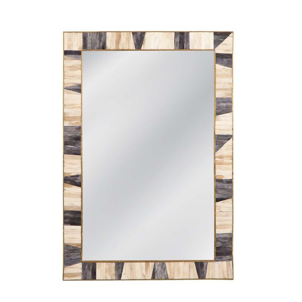 Season Wall Mirror features a natural rectangular style with a bone and brass cladded inlay frame. The bone frame features gray and ivory coloring and the natural materials means each piece is completely unique and will have some variation. This mirror is constructed of quality materials including bone, resin, and a clear glass mirror.